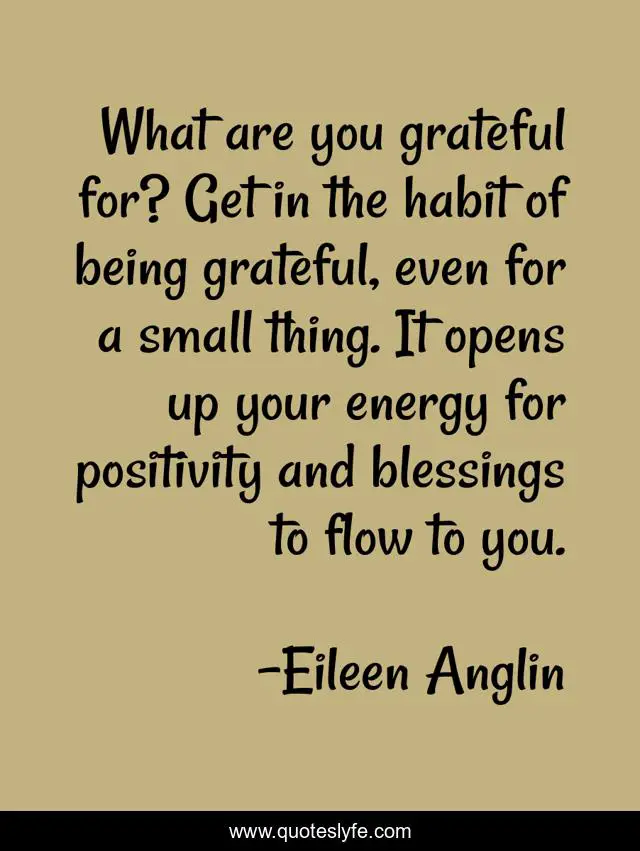 This page presents the quote "What are you grateful for? Get in the habit of being grateful, even for a small thing. It opens up your energy for positivity and blessings to flow to you.". Author of this quote is Eileen Anglin. This quote is about gratitude, grateful,.