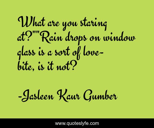This page presents the quote "What are you staring at?""Rain drops on window glass is a sort of love-bite, is it not?". Author of this quote is Jasleen Kaur Gumber. This quote is about beautiful, rainbow, lovers, lovebite, raining, rain, window, weather, love-story,.