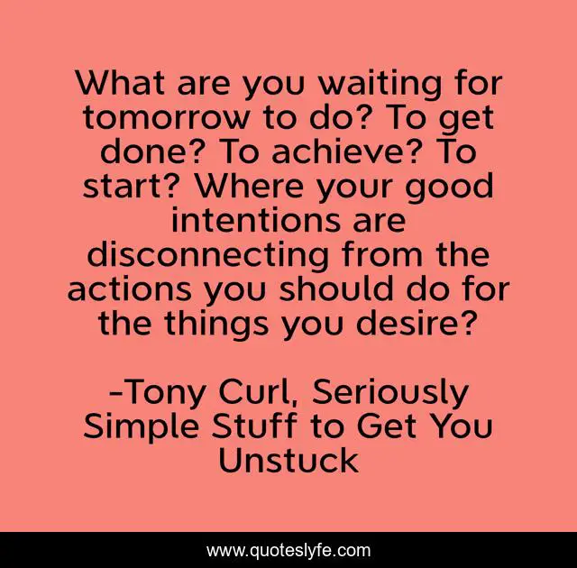 This page presents the quote "What are you waiting for tomorrow to do? To get done? To achieve? To start? Where your good intentions are disconnecting from the actions you should do for the things you desire?". Author of this quote is Tony Curl, Seriously Simple Stuff to Get You Unstuck. This quote is about desire, success, waiting, today, goals, tomorrow, achievement,.
