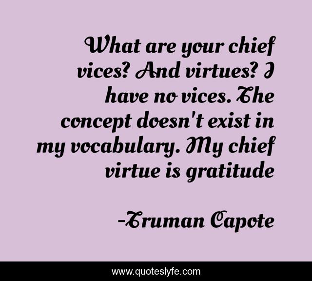 This page presents the quote "What are your chief vices? And virtues? I have no vices. The concept doesn't exist in my vocabulary. My chief virtue is gratitude". Author of this quote is Truman Capote. This quote is about capote, truman, virtue, vice,.