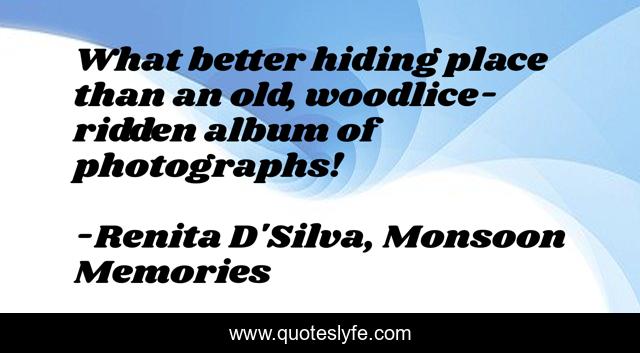 This page presents the quote "What better hiding place than an old, woodlice-ridden album of photographs!". Author of this quote is Renita D'Silva, Monsoon Memories. This quote is about indian-fiction, women-s-fiction, indians, india,.