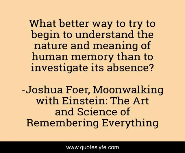 This page presents the quote "What better way to try to begin to understand the nature and meaning of human memory than to investigate its absence?". Author of this quote is Joshua Foer, Moonwalking with Einstein: The Art and Science of Remembering Everything. .
