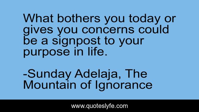 This page presents the quote "What bothers you today or gives you concerns could be a signpost to your purpose in life.". Author of this quote is Sunday Adelaja, The Mountain of Ignorance. This quote is about mountain, life, darkness, power, danger, god, people, ignorance, purpose-in-life,.