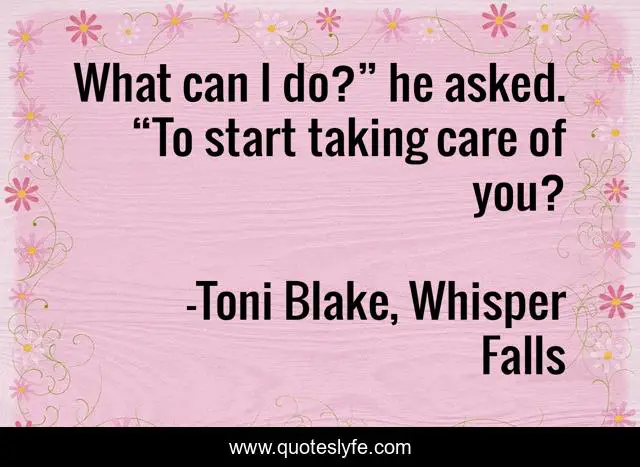 This page presents the quote "What can I do?” he asked. “To start taking care of you?". Author of this quote is Toni Blake, Whisper Falls. This quote is about romance, contemporary-romance,.