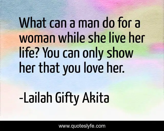 This page presents the quote "What can a man do for a woman while she live her life? You can only show her that you love her.". Author of this quote is Lailah Gifty Akita. This quote is about relationships, love, marriage, wedding, soulmate, forgiveness, affection, inspiration,.