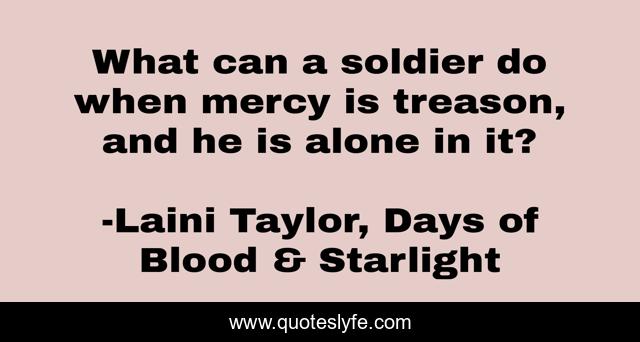 This page presents the quote "What can a soldier do when mercy is treason, and he is alone in it?". Author of this quote is Laini Taylor, Days of Blood & Starlight. This quote is about mercy, life, philosophy, war,.