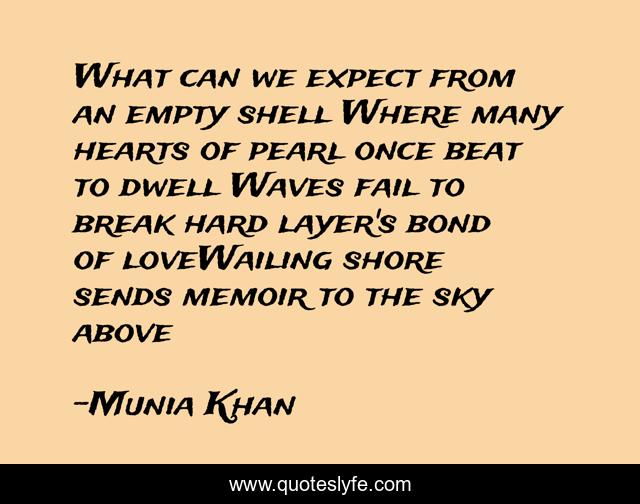 This page presents the quote "What can we expect from an empty shell Where many hearts of pearl once beat to dwell Waves fail to break hard layer's bond of loveWailing shore sends memoir to the sky above". Author of this quote is Munia Khan. This quote is about heart, layer, love, expect, sea, emptiness, layers, sky, send,.