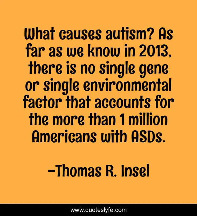 This page presents the quote "What causes autism? As far as we know in 2013, there is no single gene or single environmental factor that accounts for the more than 1 million Americans with ASDs.". Author of this quote is Thomas R. Insel. This quote is about single, autism,.