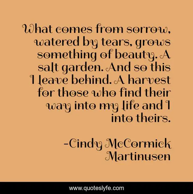 This page presents the quote "What comes from sorrow, watered by tears, grows something of beauty. A salt garden. And so this I leave behind. A harvest for those who find their way into my life and I into theirs.". Author of this quote is Cindy McCormick Martinusen. This quote is about tears, beauty-from-ashes,.