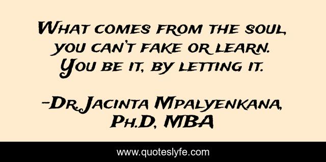 This page presents the quote "What comes from the soul, you can’t fake or learn. You be it, by letting it.". Author of this quote is Dr. Jacinta Mpalyenkana, Ph.D, MBA. This quote is about surrender, soul-work, life-lessons,.