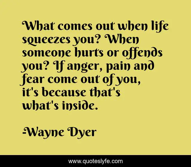 This page presents the quote "What comes out when life squeezes you? When someone hurts or offends you? If anger, pain and fear come out of you, it's because that's what's inside.". Author of this quote is Wayne Dyer. This quote is about anger, life, pain,.