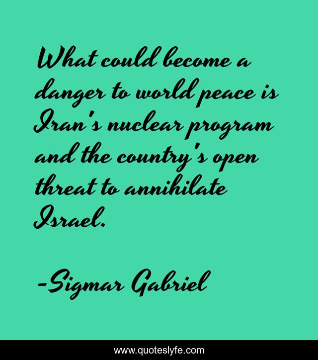 This page presents the quote "What could become a danger to world peace is Iran's nuclear program and the country's open threat to annihilate Israel.". Author of this quote is Sigmar Gabriel. This quote is about world, country, world peace,.