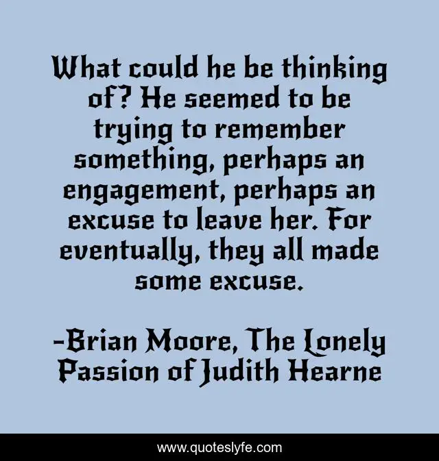This page presents the quote "What could he be thinking of? He seemed to be trying to remember something, perhaps an engagement, perhaps an excuse to leave her. For eventually, they all made some excuse.". Author of this quote is Brian Moore, The Lonely Passion of Judith Hearne. This quote is about insecurity, jilted, loneliness,.