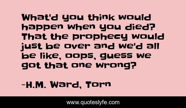 This page presents the quote "What'd you think would happen when you died? That the prophecy would just be over and we'd all be like, oops, guess we got that one wrong?". Author of this quote is H.M. Ward, Torn. This quote is about prophecy, death, humor, destiny, inevitability,.