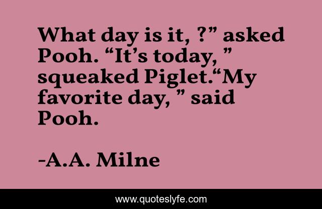 This page presents the quote "What day is it, ?” asked Pooh. “It’s today, ” squeaked Piglet.“My favorite day, ” said Pooh.". Author of this quote is A.A. Milne. This quote is about pooh, piglet, today,.