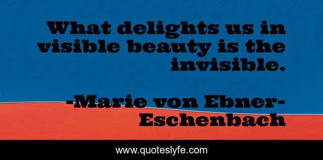This page presents the quote "What delights us in visible beauty is the invisible.". Author of this quote is Marie von Ebner-Eschenbach. This quote is about invisible, visible, us,.