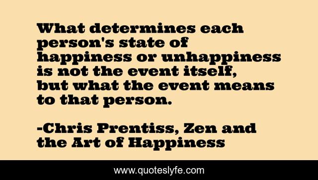 This page presents the quote "What determines each person's state of happiness or unhappiness is not the event itself, but what the event means to that person.". Author of this quote is Chris Prentiss, Zen and the Art of Happiness. This quote is about life, zen-and-the-art-of-happiness, philosophy, zen, happiness, inspiration,.