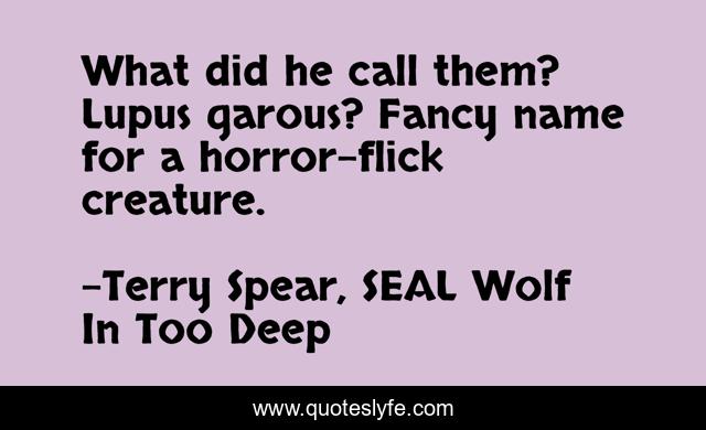This page presents the quote "What did he call them? Lupus garous? Fancy name for a horror-flick creature.". Author of this quote is Terry Spear, SEAL Wolf In Too Deep. This quote is about wolf-shifters, navy-seals, paranormal-romance, shifter-romance,.