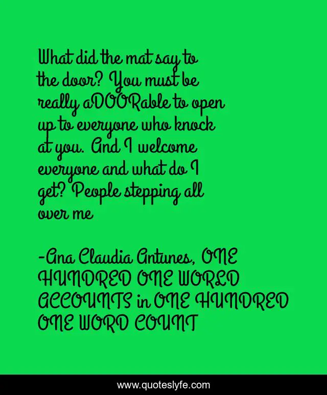 This page presents the quote "What did the mat say to the door? You must be really aDOORable to open up to everyone who knock at you. And I welcome everyone and what do I get? People stepping all over me". Author of this quote is Ana Claudia Antunes, ONE HUNDRED ONE WORLD ACCOUNTS in ONE HUNDRED ONE WORD COUNT. This quote is about funny, fables, door, mat, urban, literal-meaning, joke, one-hundred-one, open-doors,.