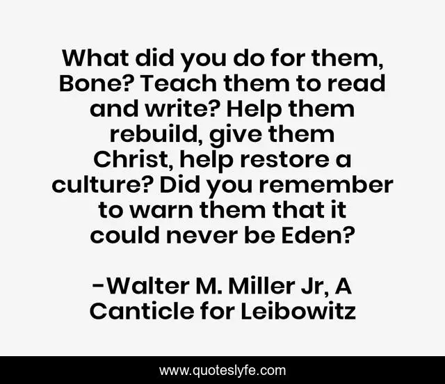 This page presents the quote "What did you do for them, Bone? Teach them to read and write? Help them rebuild, give them Christ, help restore a culture? Did you remember to warn them that it could never be Eden?". Author of this quote is Walter M. Miller Jr, A Canticle for Leibowitz. This quote is about rebirth, death, eden, god, culture, bone, cycle, dear, post-apocalypse,.