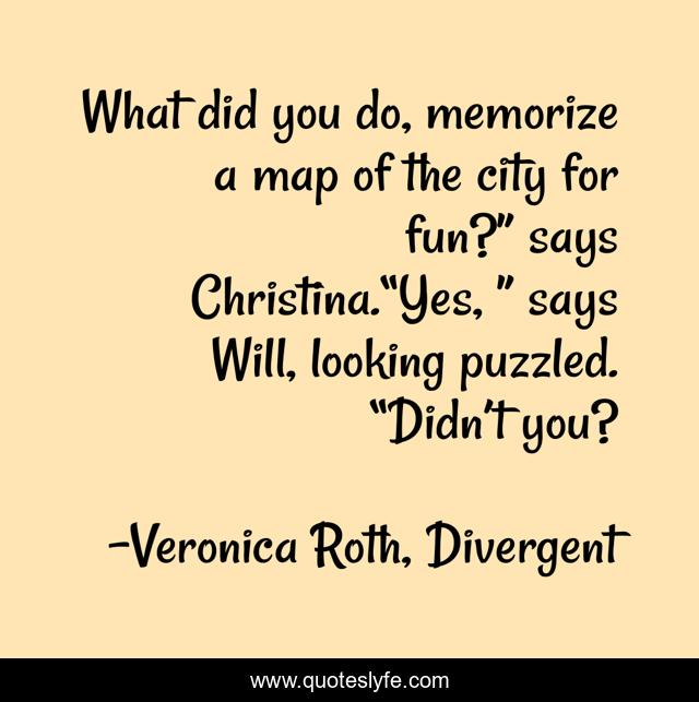 This page presents the quote "What did you do, memorize a map of the city for fun?” says Christina.“Yes, ” says Will, looking puzzled. “Didn’t you?". Author of this quote is Veronica Roth, Divergent. .