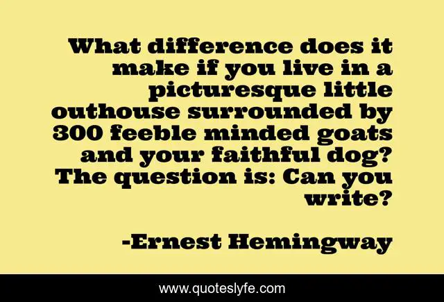 This page presents the quote "What difference does it make if you live in a picturesque little outhouse surrounded by 300 feeble minded goats and your faithful dog? The question is: Can you write?". Author of this quote is Ernest Hemingway. .