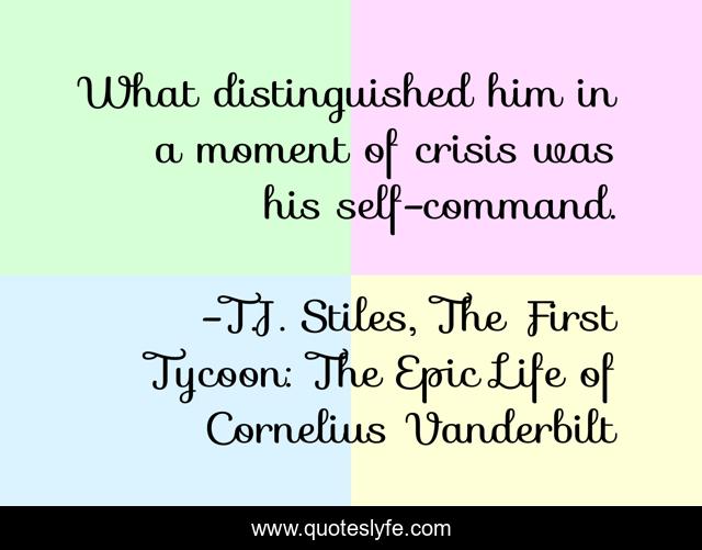This page presents the quote "What distinguished him in a moment of crisis was his self-command.". Author of this quote is T.J. Stiles, The First Tycoon: The Epic Life of Cornelius Vanderbilt. This quote is about emotion, peace-of-mind, self-discipline, leadership, self-awareness,.