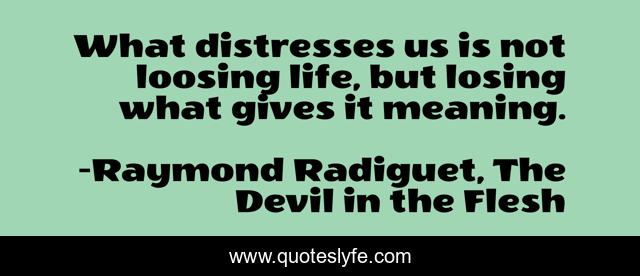 This page presents the quote "What distresses us is not loosing life, but losing what gives it meaning.". Author of this quote is Raymond Radiguet, The Devil in the Flesh. This quote is about life, death, meaning,.