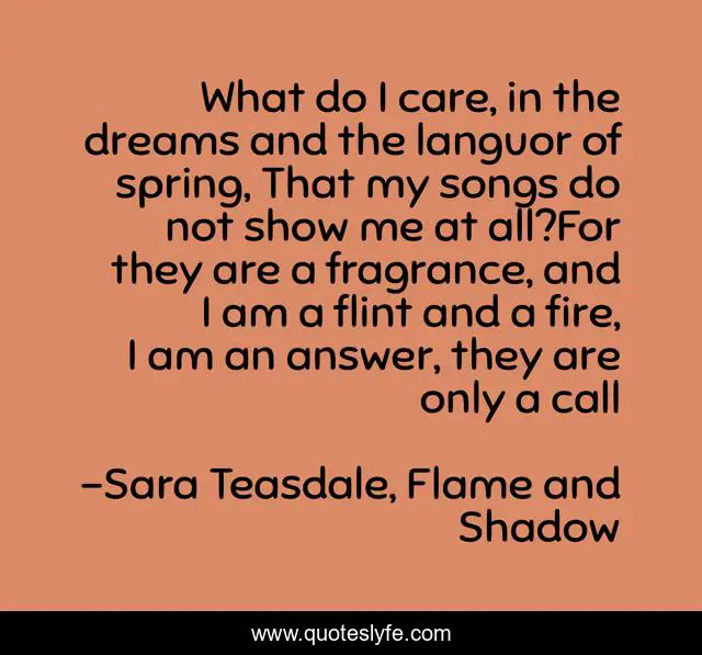 This page presents the quote "What do I care, in the dreams and the languor of spring, That my songs do not show me at all?For they are a fragrance, and I am a flint and a fire, I am an answer, they are only a call". Author of this quote is Sara Teasdale, Flame and Shadow. .