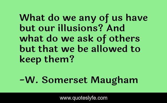 This page presents the quote "What do we any of us have but our illusions? And what do we ask of others but that we be allowed to keep them?". Author of this quote is W. Somerset Maugham. This quote is about enthusiasm, resignation, observation, inspirational, wisdom,.