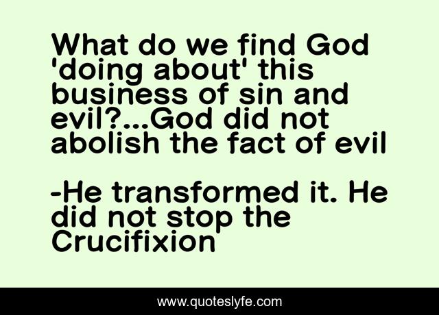 This page presents the quote "What do we find God 'doing about' this business of sin and evil?...God did not abolish the fact of evil". Author of this quote is He transformed it. He did not stop the Crucifixion. .