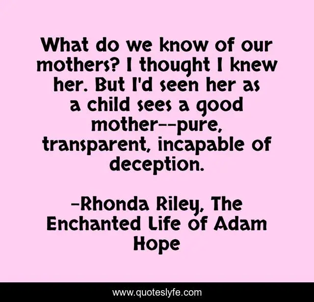 This page presents the quote "What do we know of our mothers? I thought I knew her. But I'd seen her as a child sees a good mother--pure, transparent, incapable of deception.". Author of this quote is Rhonda Riley, The Enchanted Life of Adam Hope. This quote is about knowing, knowing-someone, knowledge, perception, mother,.