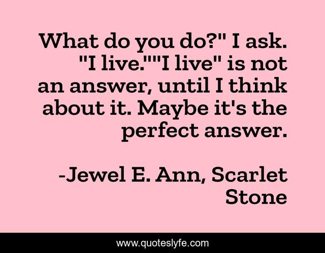 This page presents the quote "What do you do?" I ask. "I live.""I live" is not an answer, until I think about it. Maybe it's the perfect answer.". Author of this quote is Jewel E. Ann, Scarlet Stone. This quote is about answer, scarlet, live, question,.