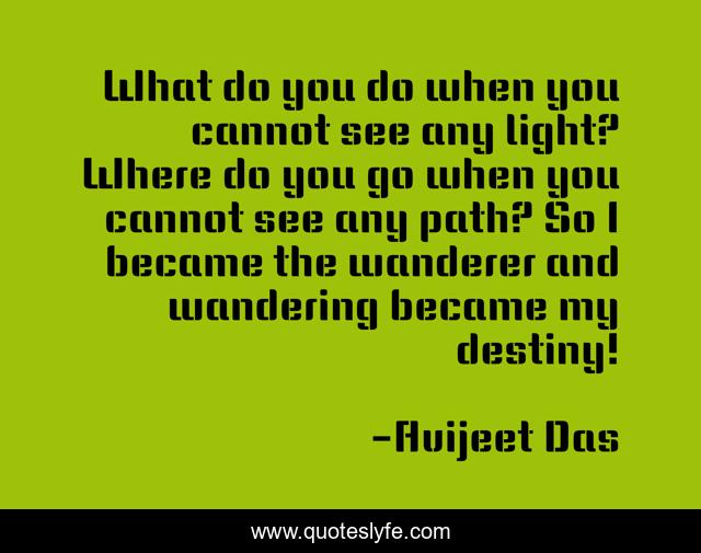 This page presents the quote "What do you do when you cannot see any light? Where do you go when you cannot see any path? So I became the wanderer and wandering became my destiny!". Author of this quote is Avijeet Das. This quote is about life, writer, wanderings, wanderer, light, wandering-is-my-destiny, drifter, poet, path,.