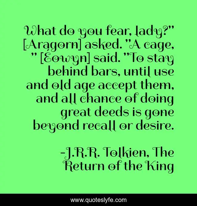 What do you fear, lady?" [Aragorn] asked. "A cage, " [Éowyn] said. "To stay behind bars, until use and old age accept them, and all chance of doing great deeds is gone beyond recall or desire.