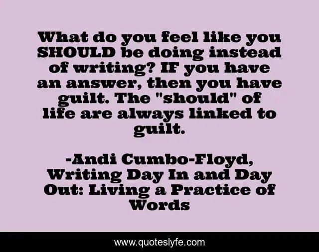 This page presents the quote "What do you feel like you SHOULD be doing instead of writing? IF you have an answer, then you have guilt. The "should" of life are always linked to guilt.". Author of this quote is Andi Cumbo-Floyd, Writing Day In and Day Out: Living a Practice of Words. This quote is about guilt, writing,.