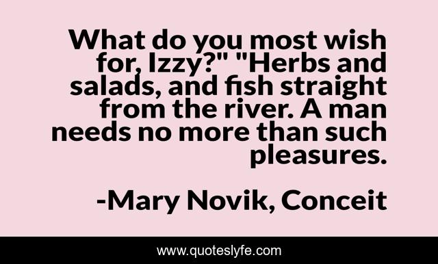 This page presents the quote "What do you most wish for, Izzy?" "Herbs and salads, and fish straight from the river. A man needs no more than such pleasures.". Author of this quote is Mary Novik, Conceit. This quote is about food, food-for-thought, pleasures-of-life,.
