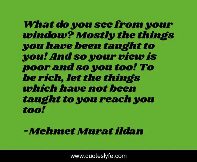 This page presents the quote "What do you see from your window? Mostly the things you have been taught to you! And so your view is poor and so you too! To be rich, let the things which have not been taught to you reach you too!". Author of this quote is Mehmet Murat ildan. This quote is about poor, window, taught, rich, murat-ildan,.