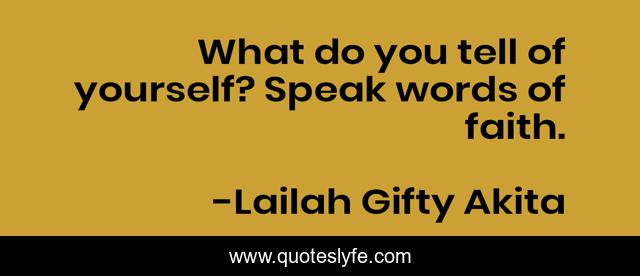 This page presents the quote "What do you tell of yourself? Speak words of faith.". Author of this quote is Lailah Gifty Akita. This quote is about faith, inspirational, self-help, inner-strength, enthusiasm, hope,.