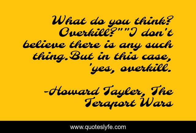 This page presents the quote "What do you think? Overkill?""I don't believe there is any such thing.But in this case, 'yes, overkill.". Author of this quote is Howard Tayler, The Teraport Wars. This quote is about exceptions, overkill, violence,.