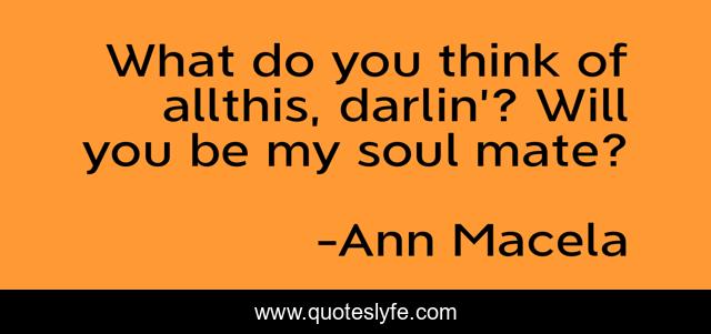 This page presents the quote "What do you think of allthis, darlin’? Will you be my soul mate?". Author of this quote is Ann Macela. This quote is about love, magic, soulmates, affection,.
