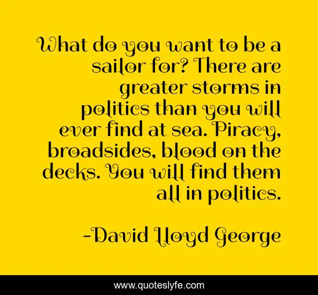 This page presents the quote "What do you want to be a sailor for? There are greater storms in politics than you will ever find at sea. Piracy, broadsides, blood on the decks. You will find them all in politics.". Author of this quote is David Lloyd George. This quote is about blood, sea,.