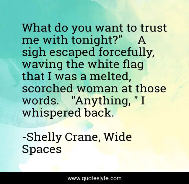 This page presents the quote "What do you want to trust me with tonight?" A sigh escaped forcefully, waving the white flag that I was a melted, scorched woman at those words. "Anything, " I whispered back.". Author of this quote is Shelly Crane, Wide Spaces. This quote is about shelly-crane, young-adult, wide-awake, significance,.