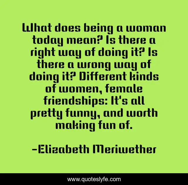 This page presents the quote "What does being a woman today mean? Is there a right way of doing it? Is there a wrong way of doing it? Different kinds of women, female friendships: It's all pretty funny, and worth making fun of.". Author of this quote is Elizabeth Meriwether. This quote is about woman, today, women,.