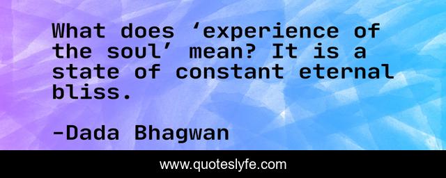 This page presents the quote "What does ‘experience of the soul’ mean? It is a state of constant eternal bliss.". Author of this quote is Dada Bhagwan. This quote is about eternal-bliss, spiritual, self-realised, eternal, self, self-realized, soul, knowledge-of-the-self, knowledge-of-self,.