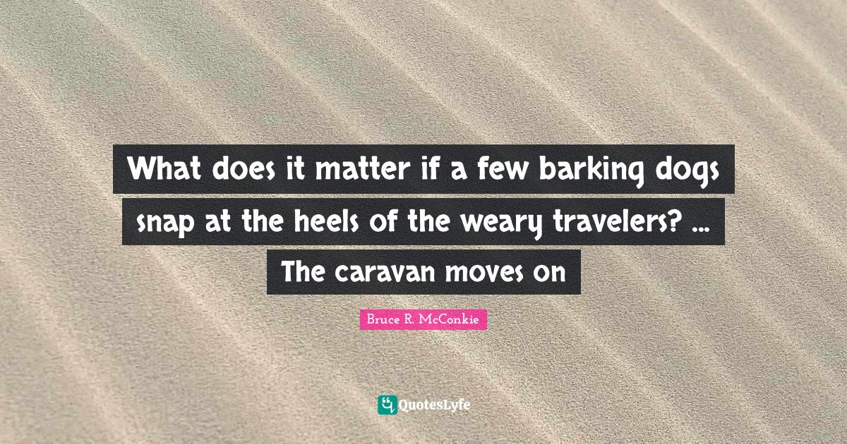 This page presents the quote "What does it matter if a few barking dogs snap at the heels of the weary travelers? ... The caravan moves on". Author of this quote is Bruce R. McConkie. This quote is about perseverance, heels, weary, dog, does it matter, barking dogs, moving,.