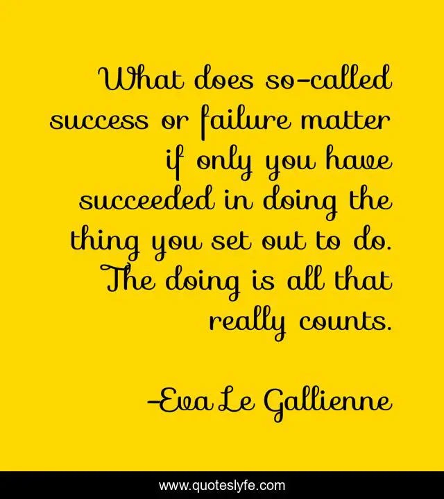 This page presents the quote "What does so-called success or failure matter if only you have succeeded in doing the thing you set out to do. The doing is all that really counts.". Author of this quote is Eva Le Gallienne. .