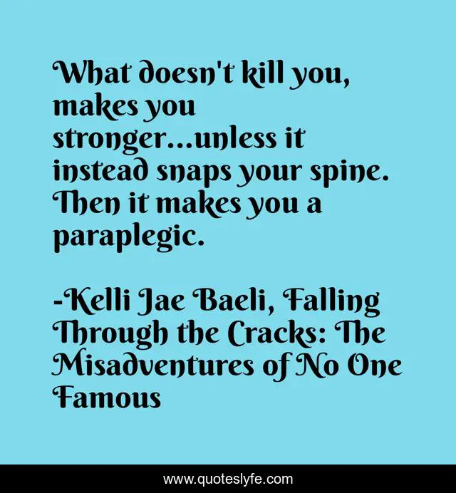 This page presents the quote "What doesn't kill you, makes you stronger...unless it instead snaps your spine. Then it makes you a paraplegic.". Author of this quote is Kelli Jae Baeli, Falling Through the Cracks: The Misadventures of No One Famous. This quote is about strength, humor,.