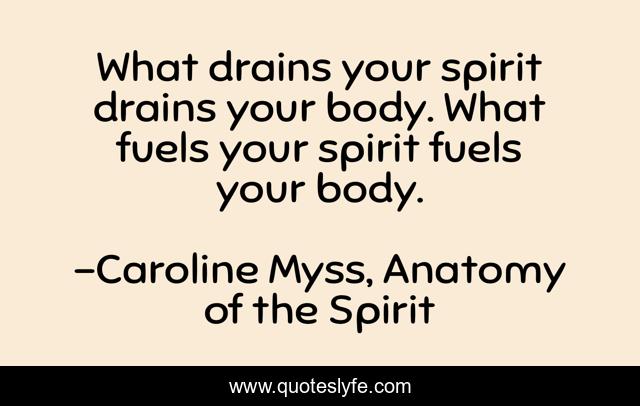 This page presents the quote "What drains your spirit drains your body. What fuels your spirit fuels your body.". Author of this quote is Caroline Myss, Anatomy of the Spirit. This quote is about consciousness, peace, soul, spirituality, health, healing, enlightenment, insights,.