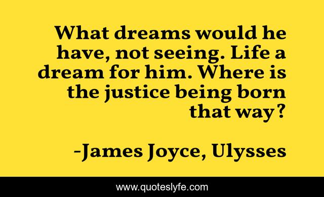 This page presents the quote "What dreams would he have, not seeing. Life a dream for him. Where is the justice being born that way?". Author of this quote is James Joyce, Ulysses. This quote is about justice, blindness, dreams,.